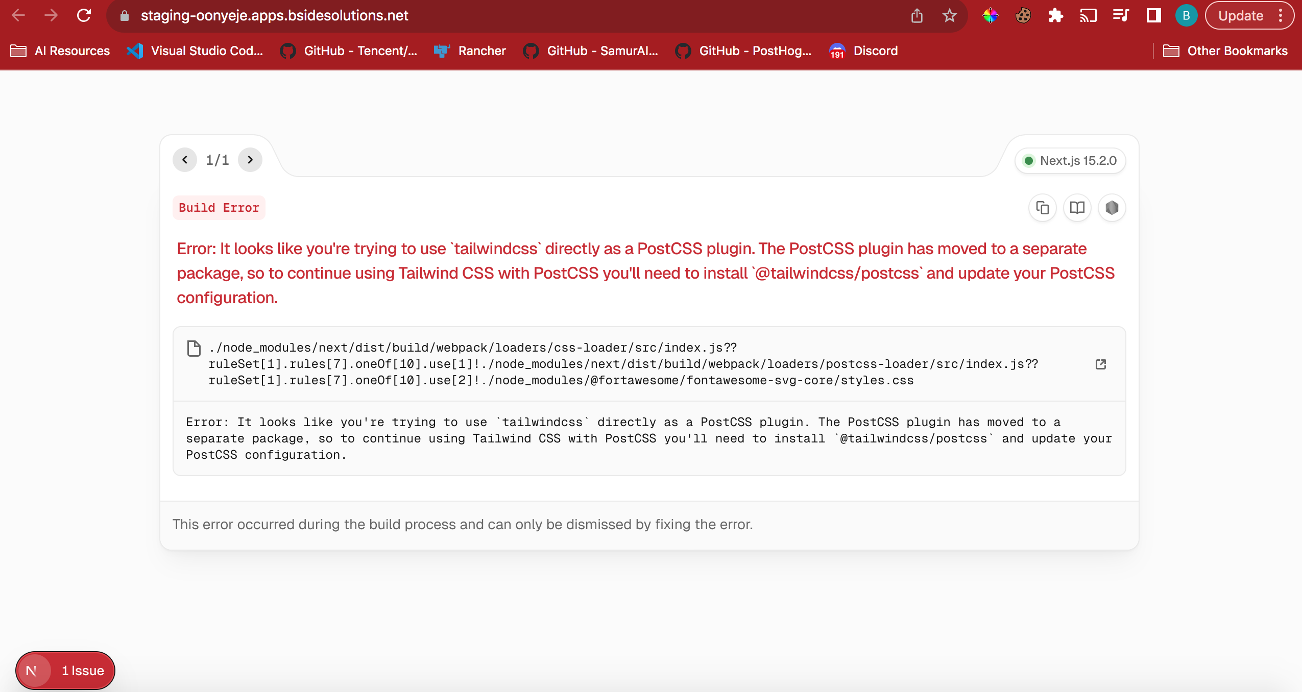 Getting tailwindcss error when attempting to view website #1